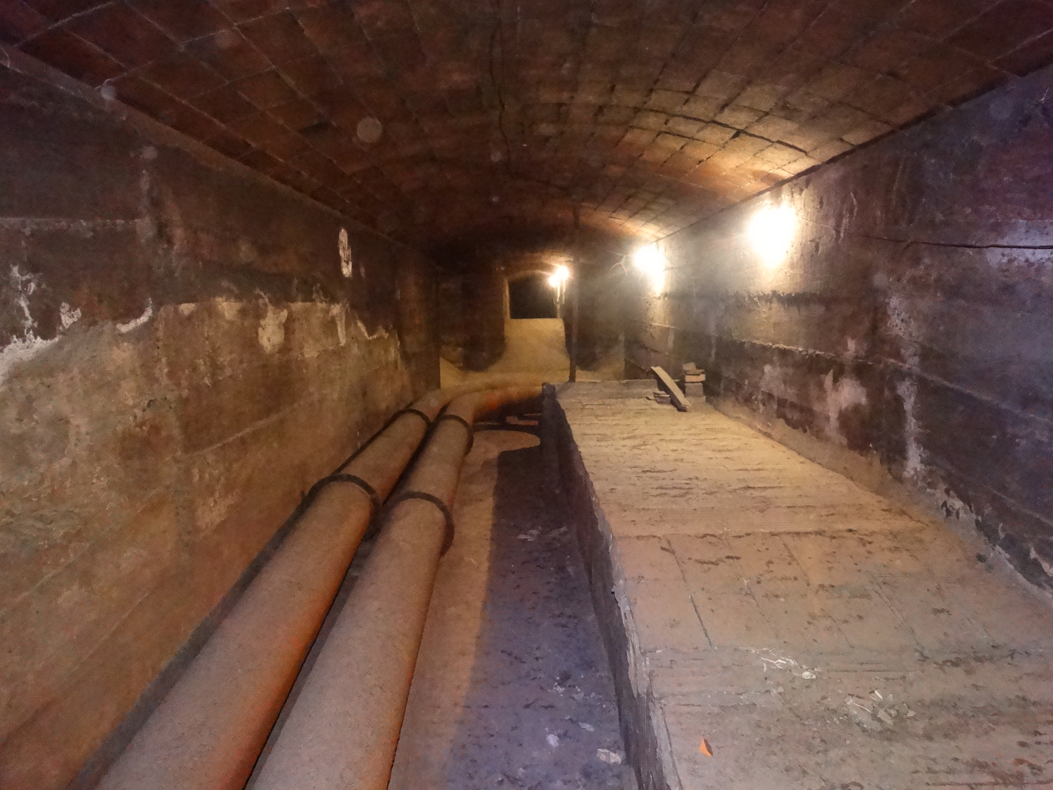 Sota la platea del teatre Conservatori, hi ha un túnel amb tot de ramificacions per on circula l’aire calent procedent de la caldera que surt a la platea per les parets laterals. A la fotografia, es veu el túnel principal.