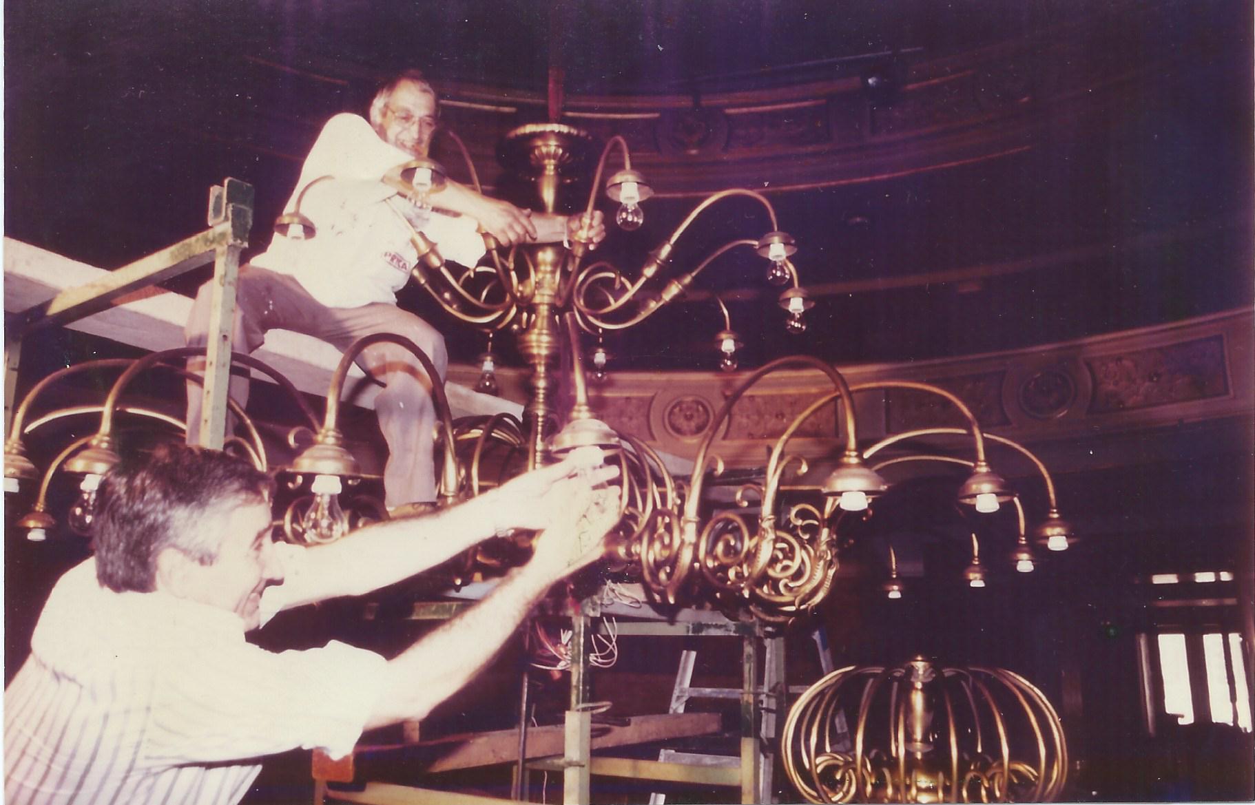 Hi ha un mecanisme a la part superior del sostre que permet fer baixar la làmpada arran de terra per canviar-ne les bombetes i netejar els seus globus. No és una feina que es pugui fer amb presses. Només fer baixar l’aranya requereix un quart d’hora. A la fotografia, podem veure Faustí Fígols i Eugeni Vall mans a l’obra.
